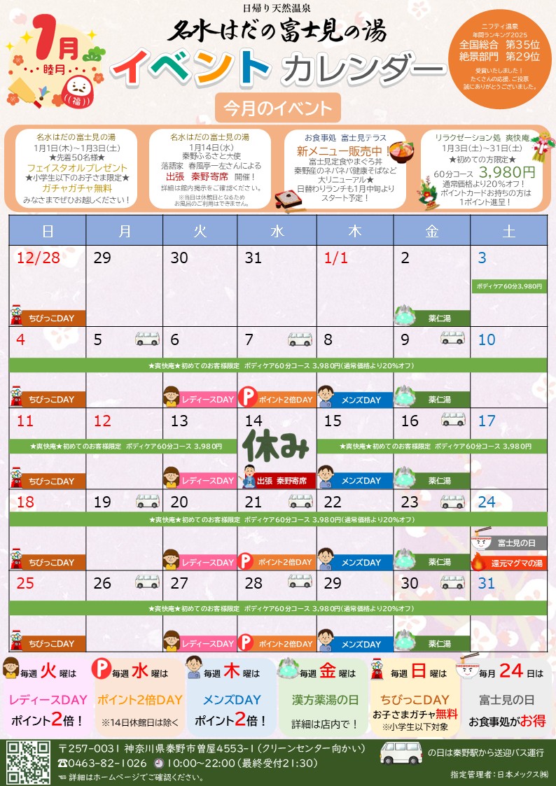 ※1月14日(水)は休館日のため、お風呂・お食事処・リラクゼーション・売店を含む全ての付帯施設が休止となります