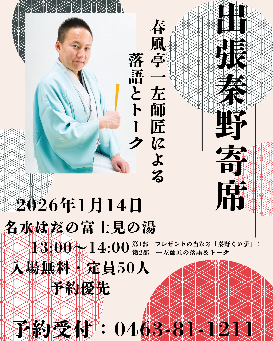 内容:春風亭一左師匠の落語&トークに加え、プレゼントも当たる「秦野くいず」などを開催